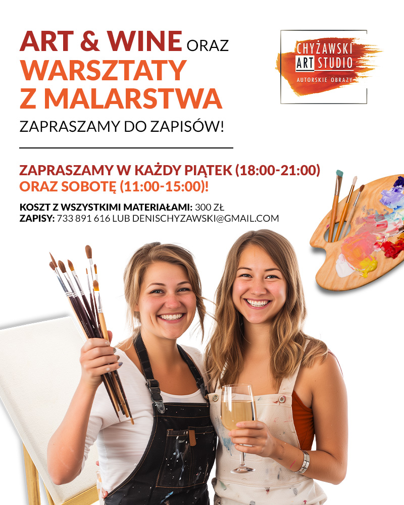 Co tydzień, w piątki wieczorem od 18:00 do 21:00, zapraszamy na niezwykłe spotkania ART&WINE. To czas nie tylko na malowanie obrazów, ale również na relaks i rozmowy w przyjaznej atmosferze, delektując się lampkami wina. Obiecujemy dobrą zabawę i niezapomniane chwile artystycznej ekspresji!